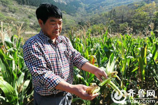 在路过一片玉米地的时候,王明德随手掰了两个玉米让记者看,一个发了霉,另一个仅有四五粒玉米。