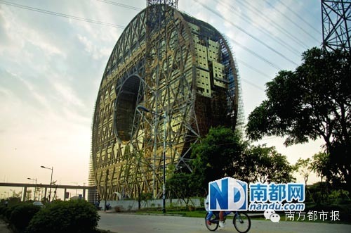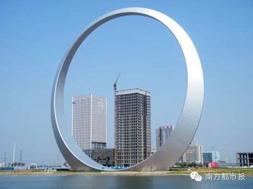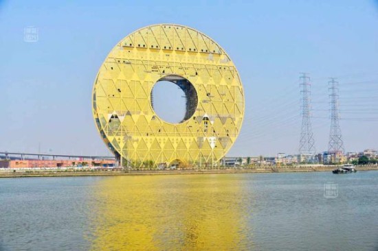 【铜钱大楼】2013年12月9日,位于广州市芳村南部珠江北岸的“铜钱大楼”在阳光的照射下金光灿灿。该项目曾经一度被网友恶搞为“铜钱大楼”,后正式命名为“广州圆大厦”。该建筑呈“U”字形状,是一个高138米的“大金环”。由于此建筑形似铜钱,网友称其为“铜钱大楼”,曾有有专家指出,该建筑风格很怪异,形状像一枚大铜钱,容易让人联想到暴发户的心态。