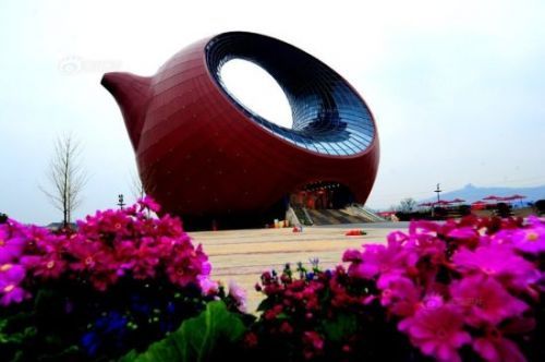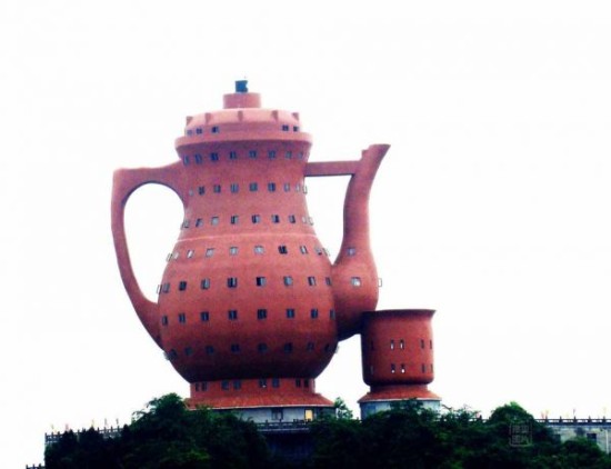 【大茶壶】该“茶壶”耸立在贵州省湄潭县火焰山上,为钢筋混凝土结构,共有11层楼,壶高48.2米,底座高25.6米,总高73.8米,壶身最大直径24米,体积28360.23立方米,为当地的茶文化博物馆。
