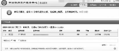 昨日,记者登录12306网站的购票系统,在选择10月22日长春至北京的列车查询中,有大量座席可以选择,于是记者选择了K40次硬卧座席。当记者输入家里老人的身份证号码后并提交订单,系统提示“系统将随机为您申请席位,暂不支持自选席位。”但点击确认后,系统锁定的座席是“硬卧、06、21号下铺、272.5 元”(如图)。