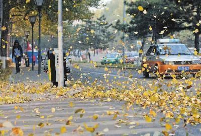 昨日,在长春市人民大街上,大风将落叶吹得漫天飞舞 本报记者 阚旋 摄