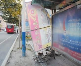 昨日,长春市吉林大路与乐群街交会处,一个宣传板被大风吹落,砸伤路人后挂在了公交亭上本报记者 阚旋 摄
