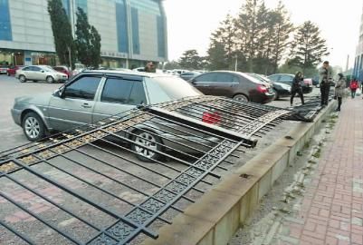 昨日的大风将长春理工大学体育馆围栏吹倒,轿车被压 本报记者 李威 摄