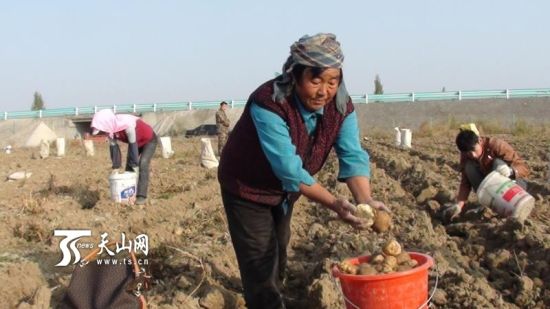 天山网讯(通讯员张祖栋 张君梅摄影报道)10月19日,笔者在新疆乌苏市四棵树镇哈尔莫墩村的马铃薯地里看到一派丰收的景象,田里的农民们个个满脸欢笑地收获着马铃薯,有的正拿着水桶捡拾着马铃薯,有的正忙着装袋,有的忙着把包装好的马铃薯装上汽车,看着一车车满载马铃薯的卡车驶出地外发住销售市场,前来收购的老板笑了,初尝甜头的农民笑了。