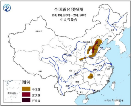 中新网10月19日电 据中央气象台网站消息,预计19日20时至20日20时,北京、天津、河北中南部、山西中部、山东西北部、河南北部、陕西关中等地有中度霾,其中,北京南部、河北西部沿山局地有重度霾。