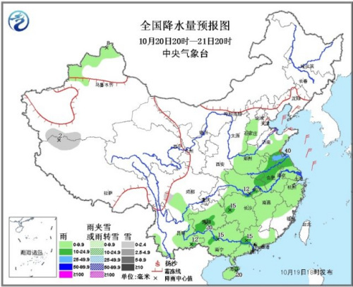 19日20时至20日20时,青海东南部、西藏东部等地有小雪(雨)或雨夹雪;东北地区东南部、西北地区东南部、西南地区大部、江汉、黄淮、江淮北部等地有小到中雨,其中,重庆北部、湖北西部、河南南部、苏皖北部等地有大到暴雨(50~80毫米)。内蒙古东部和东北地区西部有4~6级风。渤海将有5~6级西南风转7~8级、阵风9级的东北风。