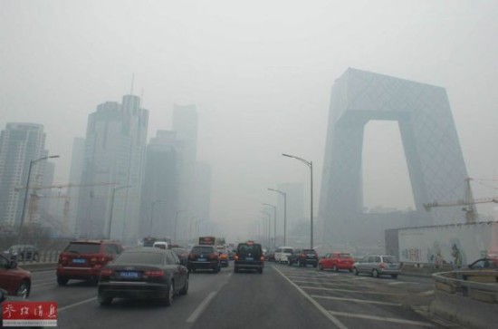 资料图:车辆行驶在雾霾笼罩的北京街头,中央电视台新址大楼依稀可见。新华社发(樊甲山 摄)
