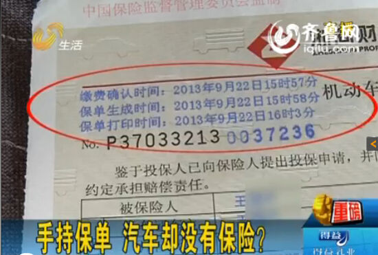 王先生说他的车去年投保了,有一张保险单可以作为证明。该保险单显示,这辆车是在浙商财产保险有限公司投的保,投保时间是2013年9月22号,生效时间是2013年9月23号到2014年9月22,上面打印着王先生的名字,盖着保险公司的公章。王先生说,他也不明白为什么手里拿着保险单,但是查询不到车辆的投保记录。