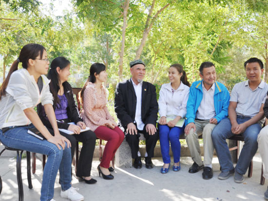 “现在我每天下午都和老伴在外面散散步,有时候也会去一下巴扎。”阿布都艾尼老人(左四)对社区工作人员说道。