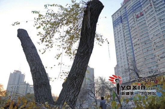 10月23日,为建地铁一号线站台,北门转盘小游园内的树木已被砍掉枝叶、保留树干做移植前准备工作,确保成活。亚心网首席记者朱翊 摄