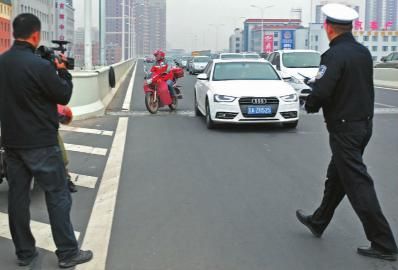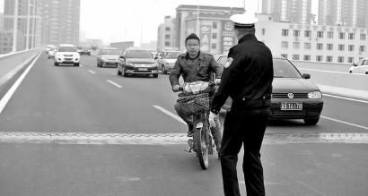 市民骑电动自行车上快速路被交警拦住 本报记者 白石 摄