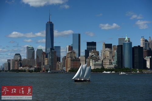 资料图片:2013年6月12日,一艘帆船从美国纽约曼哈顿的建筑前驶过。新华社记者王雷摄