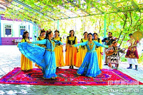 搞一站式乡村旅游少不了村里的文艺小分队。“访惠聚”工作组和村委会召集村里有才艺的村民组成演出队伍,经协商与旅游公司达成协议,按场次人数为演出村民发酬劳。小分队的成员们大都热爱音乐、舞蹈,平日在家种地或在周边做小买卖,努尔买买提就是其中一个。他平时种地、开馕店,有游客到来,便聚在一起为游客表演互动节默每一场的表演时间不长,不耽误正常工作,家人都特别支持他的“兼职”,他也比从前更快乐了。