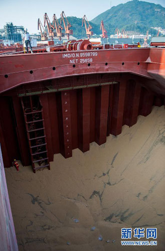 10月27日,深圳检验检疫局工作人员在一艘停泊在赤湾码头的菲律宾籍货轮上查看由阿根廷进口的黄豆。当日,深圳检验检疫局举行新闻发布会,宣布深圳蛇口港、赤湾港、大铲湾港和盐田港四个口岸获得首批国家进境粮食指定口岸资质。深圳是我国进口大宗农产品的重要口岸,其中进口小麦量居全国第二位、进口油菜籽占全国总进口量的五分之一。2013年经深圳口岸进口的大豆、小麦、玉米、油菜籽等粮食和油料达292万吨,今年1-9月达到223.7万吨。新华社记者 毛思倩 摄