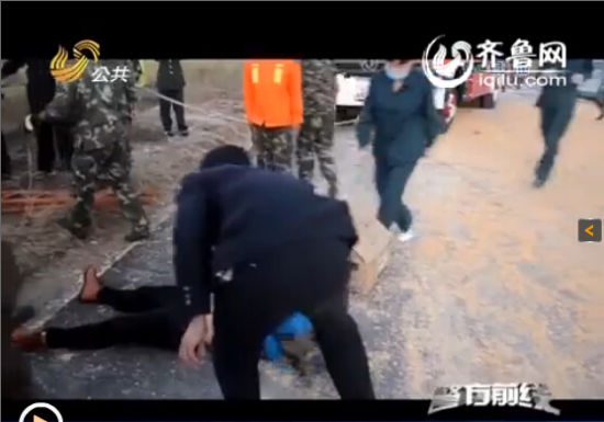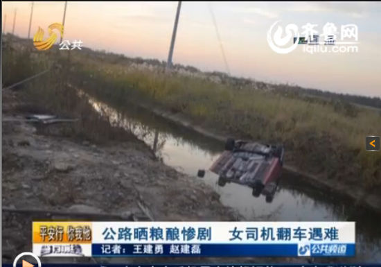 滨州公路晒粮酿惨剧 红轿车四脚朝天女司机遇难