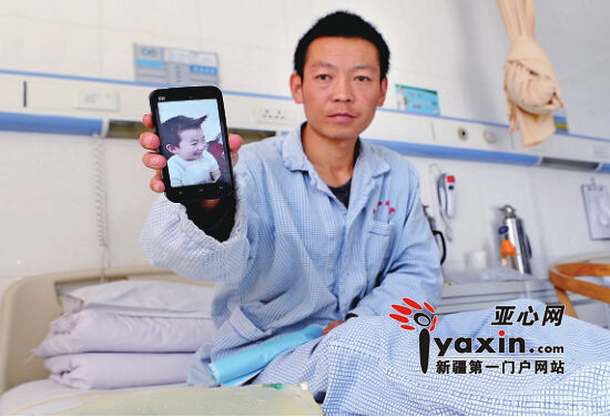 10月29日,病床上的何刚向记者展示手机里儿子的照片,每当想放弃治疗时,他都会想起儿子,从而又坚持下来。目前,他在医院接受最省钱的腹膜式透析治疗。亚心网记者 张万德 摄