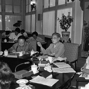 1992年7月3日,中共中央政治局常委宋平在中南海怀仁堂与出席高校党建工作会议的代表座谈。