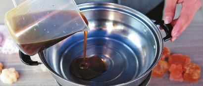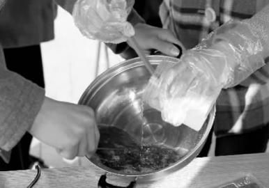 将皂基和过滤后的废油一同放进平底锅加热,由于皂基熔点在50℃左右,一旦皂基溶化,就可以了,将油盛出,放进容器。加热废油的同时,将称量好的火碱加水中搅拌。吴盼燕强调,因为火碱遇水会产生接近90℃的高温,并会散发热量和气味,制作时一定要戴手套,并处于通风状态。