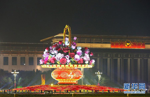 11月4日晚在北京天安门广场拍摄的灯光辉映中的“中国梦”主题花坛。 11月4日至11日,北京市景观照明仿效国庆期间按重大节日标准开启,所有城市夜景照明将全部打开,长安街沿线部分楼宇也将开启室内照明打出内透光。新华社发(王振 摄)