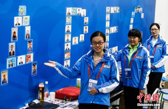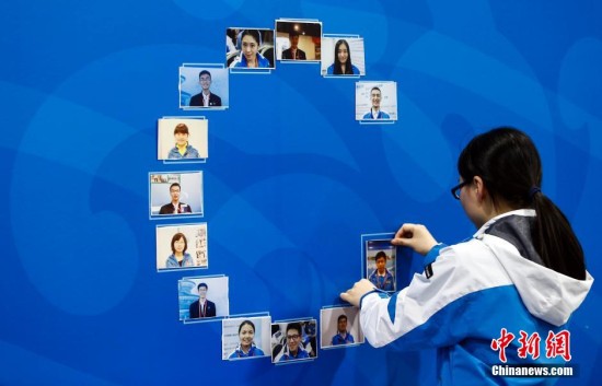11月5日,2014年亚太经合组织(简称APEC)最后一次高官会在北京国家会议中心举行,拉开了今年APEC领导人会议周的大幕。北京各大高校的志愿者也开始进入了繁忙的工作状态,图为一名志愿者在国家会议中心的志愿者之家将同学的笑脸拼成APEC字样。中新社发 张浩 摄