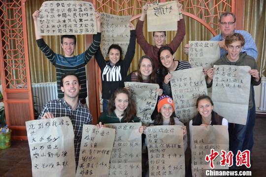 图为"洋学生"们的书法展示。 李洋 摄