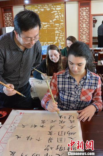 中新网石家庄11月3日电 (李洋)一群“洋学生”一招一式地打着太极拳,利用午休玩跳绳、踢毽子,跟着中国教师学习书法,这一幕幕不是电视中的情景,而是发生在石家庄市第42中学。