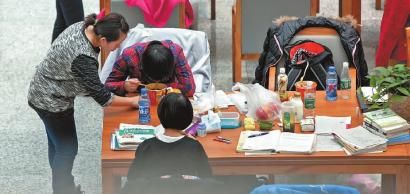 图书管理员赵丹一边收拾桌上的书,一边巡回劝阻,“阅览室里是不可以吃东西的,食物的残渣或油渍留在书上很容易招来虫子,损坏图书。”赵丹说,正常来说,阅览室是不能自修的,里面的座位只能提供给借阅图书的读者使用,“但周末人太多了,自修区没有座位,我们不得不开放阅览室给自修的读者。”