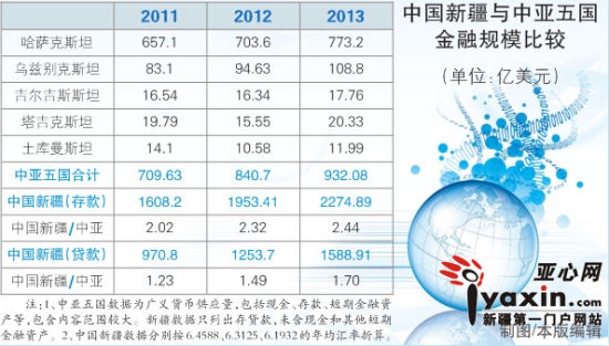 张文中在分析了中亚五国与新疆及乌鲁木齐存贷款数据比较后发现,2013年新疆存贷款规模均远超中亚五国存贷款的合计数量,仅乌鲁木齐一地的2013年的存款规模就相当于中亚五国97.2%的规模。