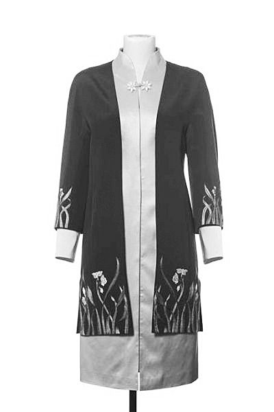 女配偶为开襟、连肩袖外套,内搭立领旗袍裙