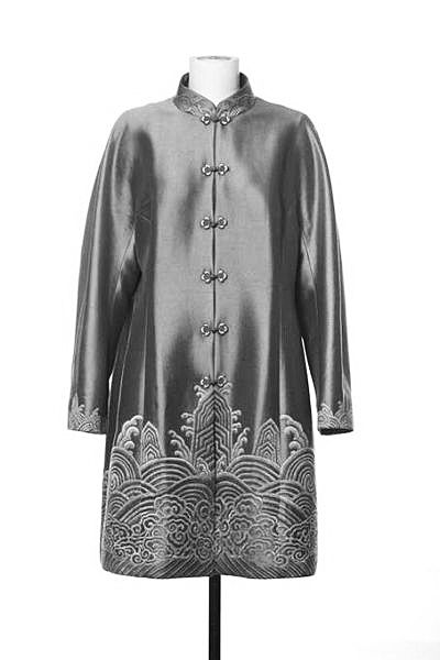 女领导人服装为立领、对襟、连肩袖,双宫缎面料、饰海水江崖纹外套