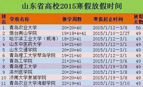 (原标题:2015山东高校寒假时间表出炉 青岛农业大学放56天)