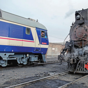 近日,记者驱车前往哈密以西80公里的三道岭煤矿。在三道岭南站,6辆黑色蒸汽机车、4辆黑色内燃机车停靠在站台上。一分钟后,一辆蒸汽机车喷着遮天白烟往矿区开去,发出铿锵有力的排气声响。