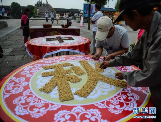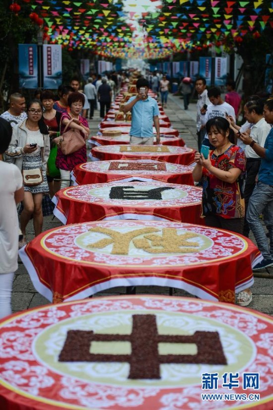 9月4日,塘栖古镇的居民在长街宴上用黄豆、赤豆等组成“中秋月团圆”的字样摆出“长街宴”,共同“邀明月 迎中秋”。临近中秋,浙江省杭州市余杭区的千年古镇塘栖镇启动了“百米长龙邀明月,千年古镇共祈福”这一传统民俗活动来迎接中秋。镇上的居民沿街摆起长街宴,桌上摆放着各色水果、农家粽子、米塑糕点、莲藕五谷等吃食,共同赏月祈福,迎接中秋。同时还在古镇的广济桥畔,用游船搭起花灯,明月当空,花灯辉映,构成了古镇中秋的美丽风景。新华社记者 徐昱 摄