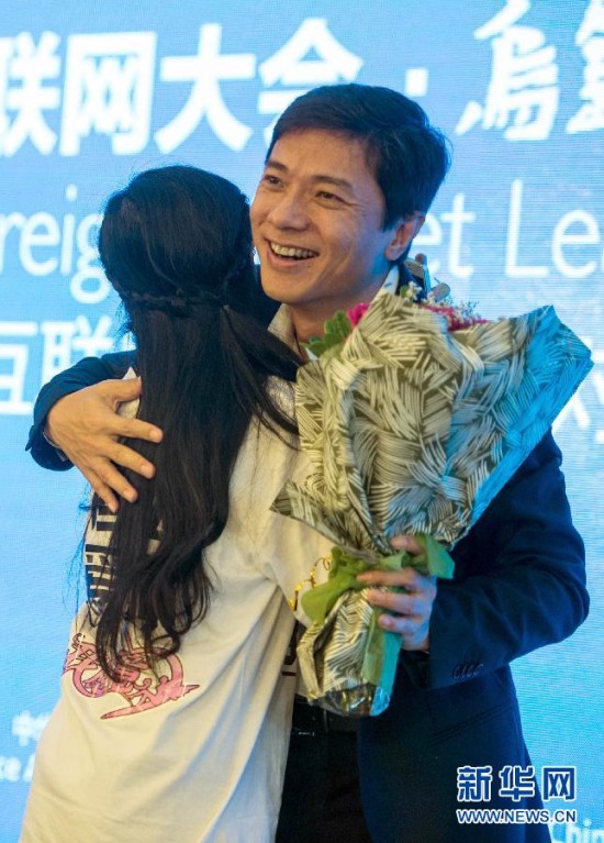 11月20日,百度董事长李彦宏(右)在高峰对话上接受一名女“粉丝”献花。当日,首届世界互联网大会进入第二天,中外互联网领袖高峰对话在浙江乌镇举行。 新华社记者韩传号摄
