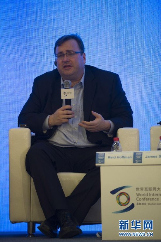 11月20日,领英联合创始人雷德·霍夫曼在对话会上发言。 当日,首届世界互联网大会进入第二天,中外互联网领袖高峰对话在浙江乌镇举行。新华社记者鞠焕宗摄