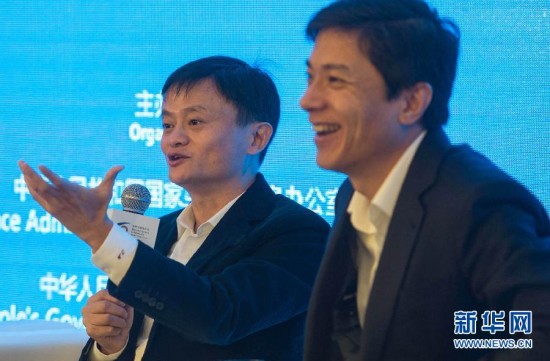 11月20日,阿里巴巴集团董事局主席马云(左)、百度创始人董事长兼CEO李彦宏在高峰对话上。当日,首届世界互联网大会进入第二天,中外互联网领袖高峰对话在浙江乌镇举行。 新华社记者韩传号摄