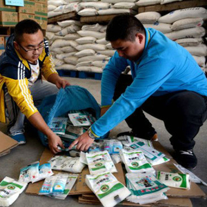 资料图片:2014年10月24日,郑州查处饲料添加用盐充当食用盐大案,图为工作人员在清点缴获的假冒食用碘盐包装。