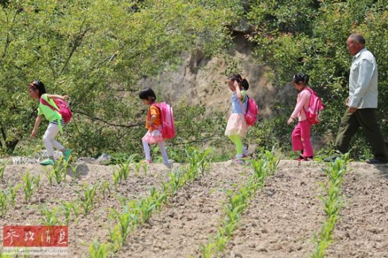 资料图片:在秦岭腹地陕西省宁陕县丰富镇,有一个只有一位老师和13名学生的教学点——猴子坪小学。图为放学后黄同谦老师送孩子们回家。