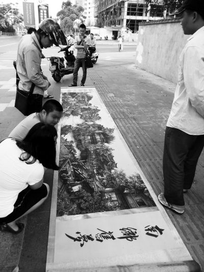 昨日上午8时40分左右,在海口高登西街路口处人行道上,记者看到一名头戴帽子、脚穿拖鞋的中年男子正在摆摊卖画,10余名市民围着一幅摆在地上的长卷画议论纷纷。这幅画宽约七八十厘米,长约4米,整幅画看起来很旧发黄、古色古香;画上写着四个大字“南乡旧梦”,卷轴上还落款“民国张孝友”字样,上面的字迹都很工整。