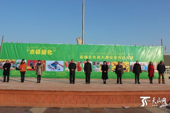 ???????? 天山网讯(喀什日报记者张胜开摄影报道)12月5日,新疆喀什市人民广场人头攒动,100幅农民画优秀作品被画框装饰一新,“去极端化”新疆农民画大赛优秀作品巡展启动仪式正在这里隆重举行。