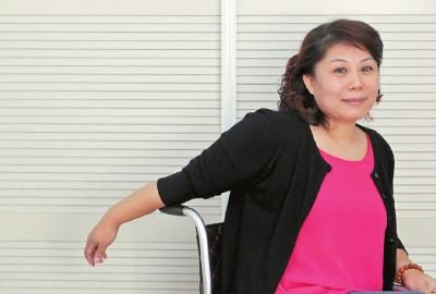 轮椅上,钟玉在微笑。脸上薄施淡妆,眉毛精心描画,暗褐色的头发梳得规整,在脑后扎成一个小马尾。粉色打底衫,外罩黑色针织开衫,下身是牛仔裤和旅游鞋。