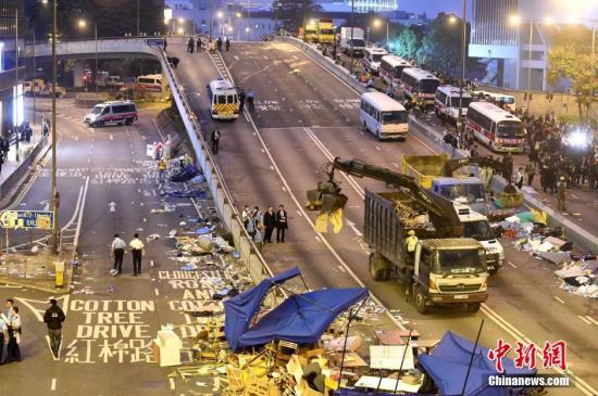12月11日下午,香港警方依法对金钟非法“占领区”全面清场。图为清理路障现场。中新社发 张宇 摄