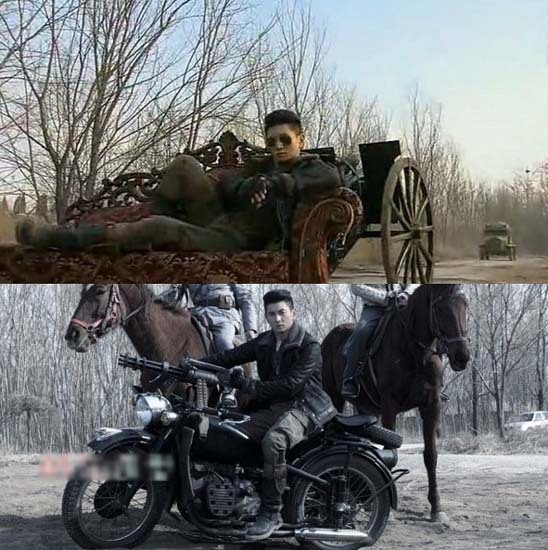 美国《华尔街日报》网站10月6日报道称,在《向着炮火前进》这部电视剧中,演员吴奇隆饰演的雷子枫是个土匪头子,他穿着皮夹克,戴着大墨镜,梳着大背头。剧中有一幕,他悠然地躺在紫红色的躺椅上。当他骑着黑色摩托车逃跑的时候,身后还有个漂亮的女演员紧搂着他。