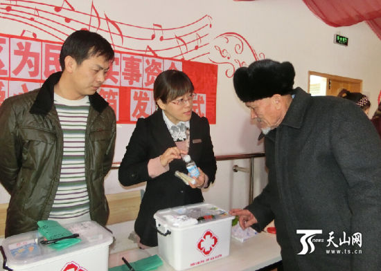 社区干部在给受赠群众耐心的讲解药箱物品的使用方法