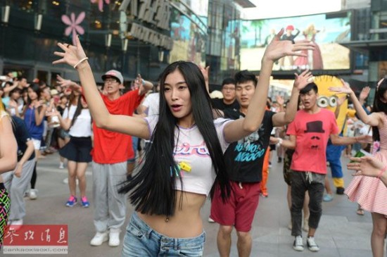 资料图片:2014年7月13日,市民在沈阳市中街进行神曲《小苹果》快闪表演。新华社记者潘昱龙摄。