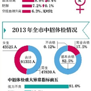 此次报告中还公布了关于高招、中招等专项体检的数据,统计显示,2013年度全市参加高招体检的考生共有71813人,其中,“完全合格”者仅有8042人,占11.2%。中招方面,全市91355名参加体检的考生中,完全合格的人数仅为16005人,占17.5%。