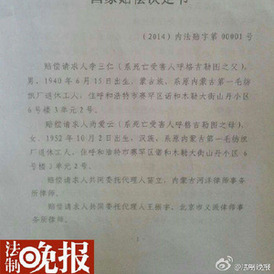 【呼格吉勒图案国家赔偿项目及金额】 一、向赔偿请求人李三仁、尚爱云支付死亡赔偿金、丧葬费共计1047580元; 二、向赔偿请求人李三仁、尚爱云支付呼格吉勒图生前被羁押60日的限制人身自由赔偿金12041.40元; 三、向赔偿请求人李三仁、尚爱云支付精神损害抚慰金100万元。 以上各项合计2059621.40元。来源:内蒙古高院