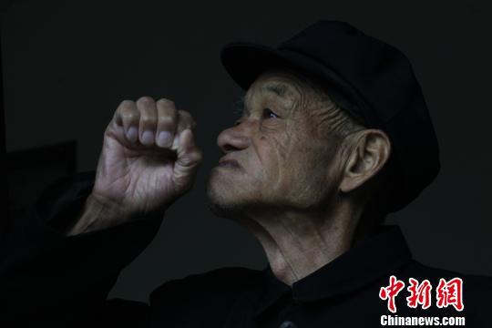抗战老兵徐殿臣,12岁当兵,今年87岁。老人刚参军时扛不动枪,是部队的司号员,图为老人在模仿当年的吹号动作 屈公选 摄