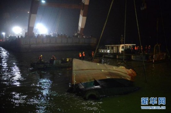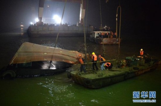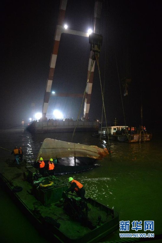 15日下午长江福北水道发生沉船事故,截至16日凌晨2时仍有约20名船员失踪。目前沉船船头已经浮出水面,现场搜救作业仍在紧张进行中。据江苏海事局副局长王士明介绍,事发时间为15日下午3时许,地点在长江福北水道FB14号标附近,沉船随水流漂移约3公里到FB13号标处,事发时江面气象条件没有异常。江苏海事局的打捞工作人员按照两条钢筋穿过沉船船体、整体起吊离水的打捞方案进行作业。截至目前一条钢筋已经成功穿过沉船头部,部分船头部已经浮出水面,剩余一条钢筋仍未能穿过船尾。新华社记者 沈鹏 摄
