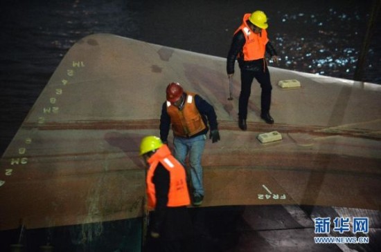 1月16日凌晨,工作人员在沉船船体上查看情况。新华社记者 沈鹏 摄